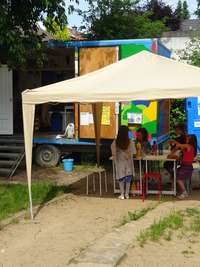 In den Sommerferien zieht das Krea-Mobil um auf die große Wiese in Refrath zwischen den Straßen „An der Wallburg“ und „Kippekausen“.