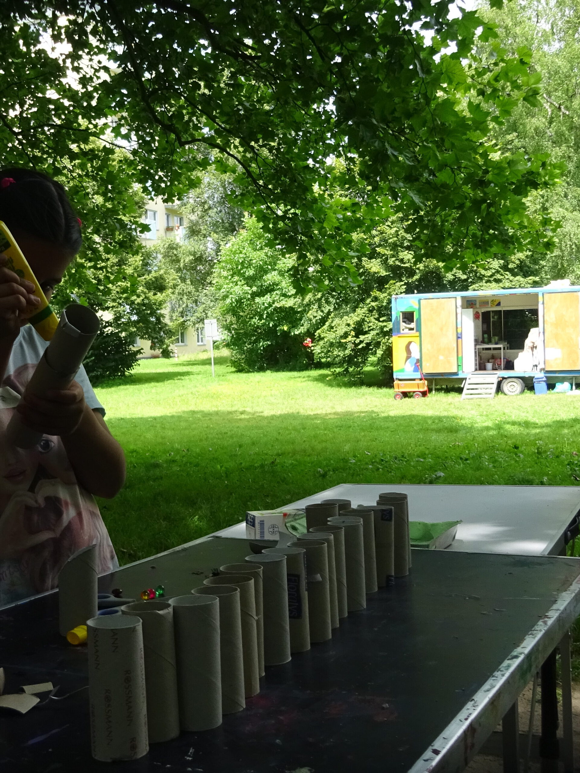 Das bunte Krea-Mobil ist ein Bauwagen der an unterschiedlichen Orten für kreative Aktionen eingesetzt wird.